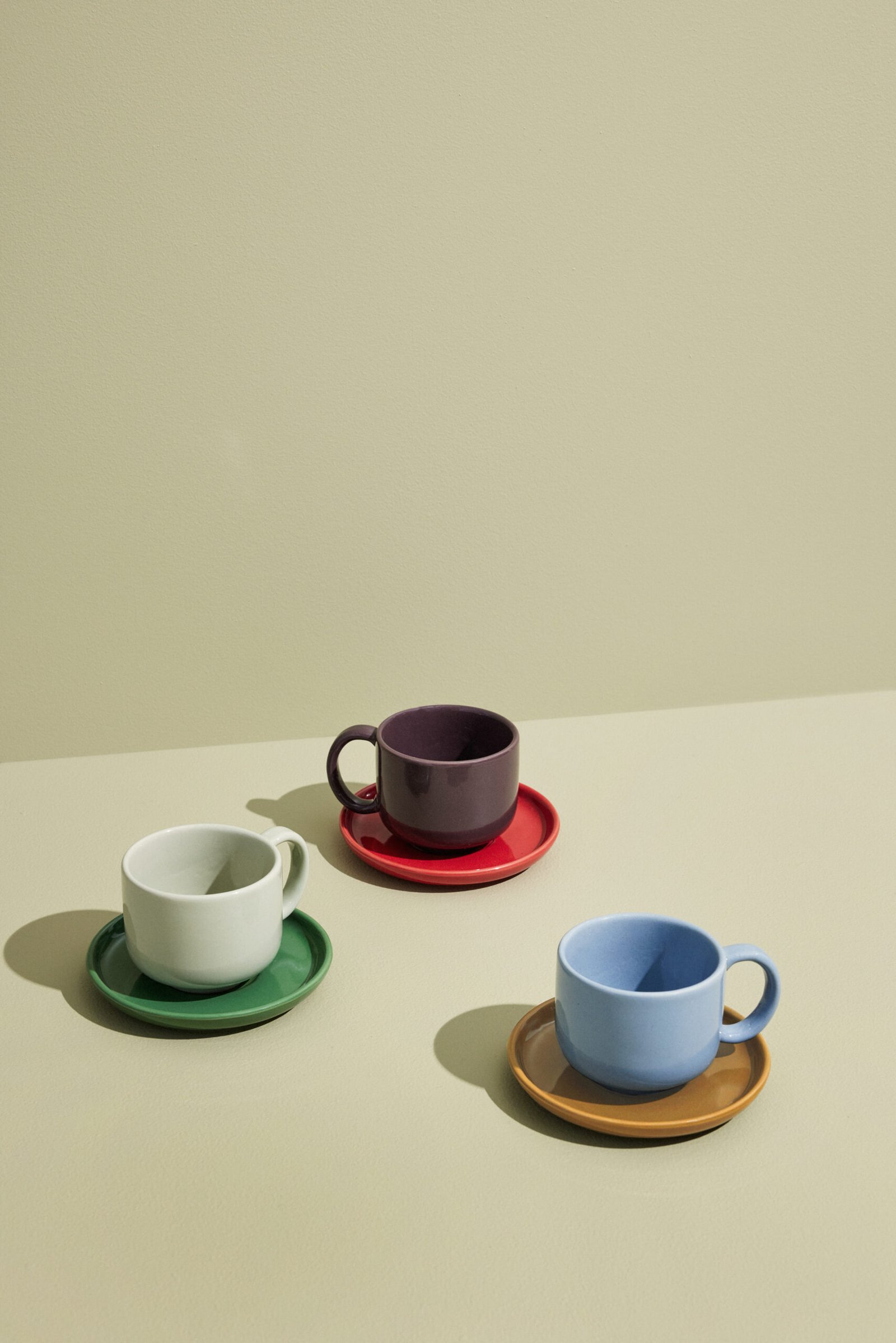 Et smukt retroinspireret sæt med sandfarvet kop og grøn undertallerken i en ensfarvet skinnende glasur.