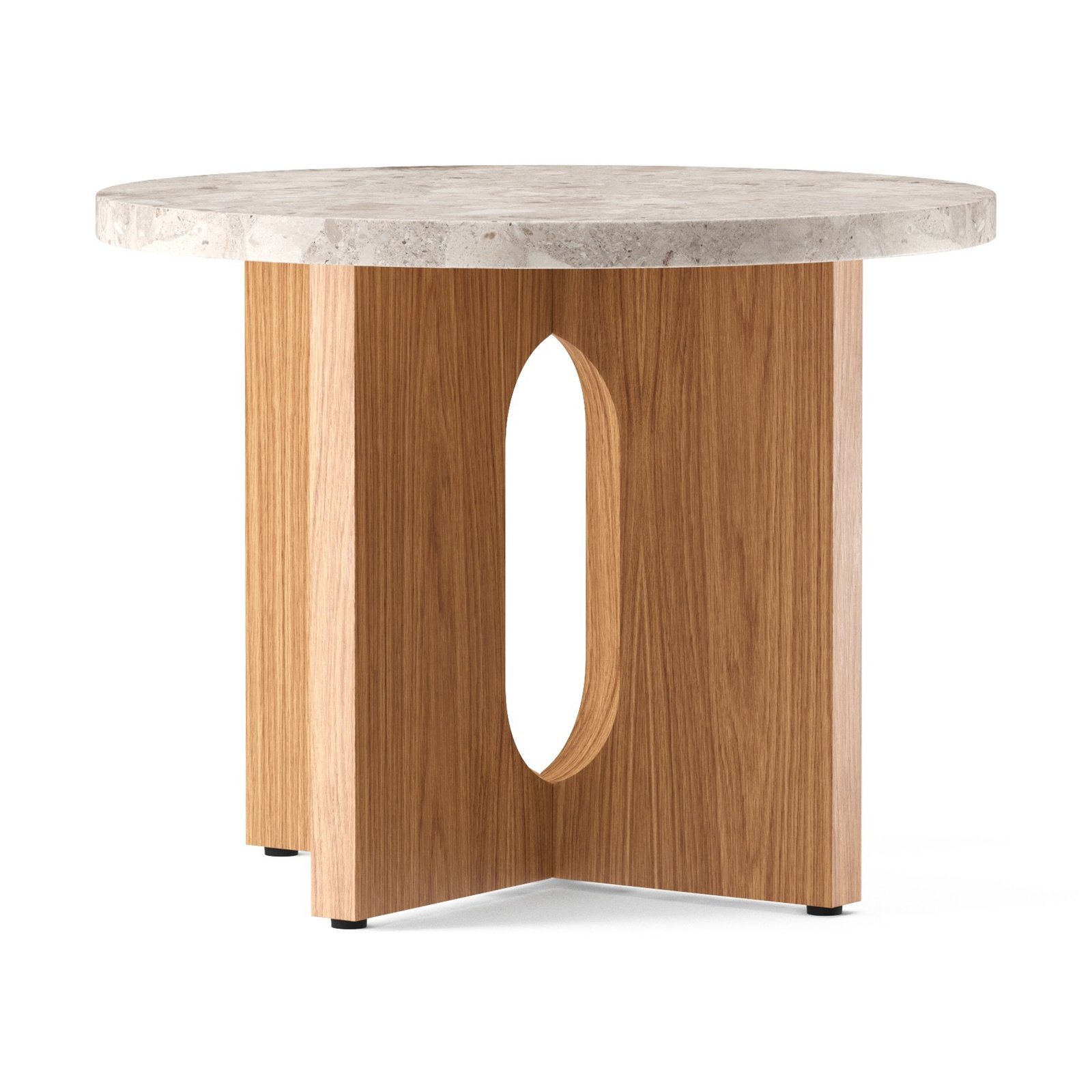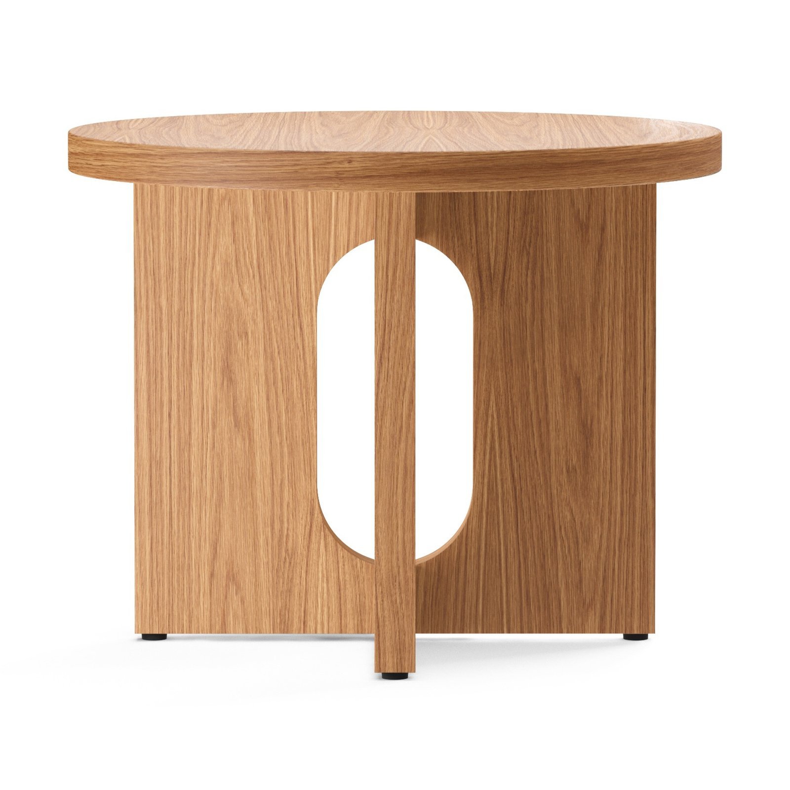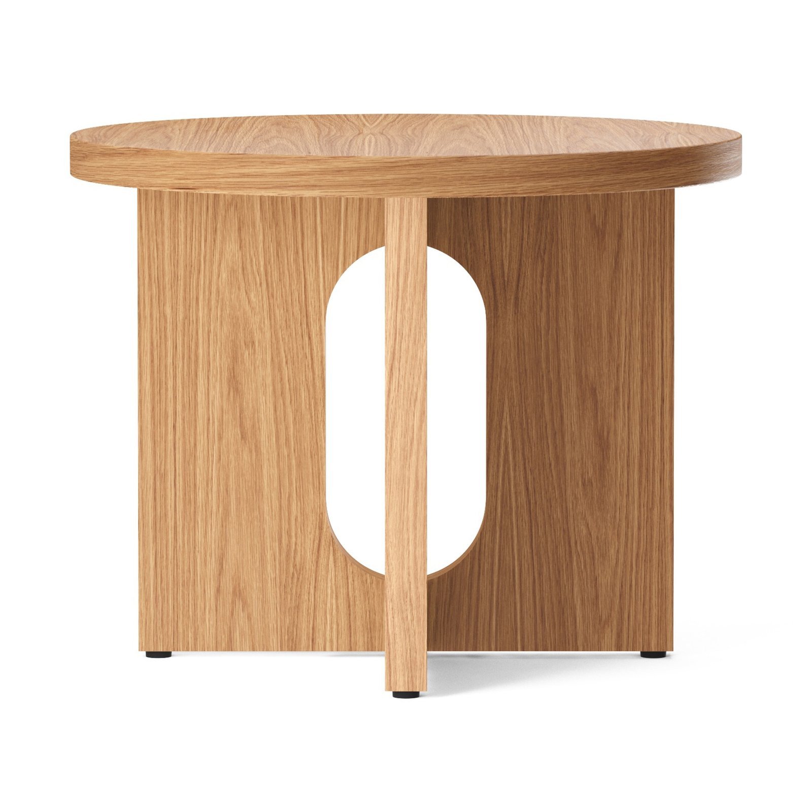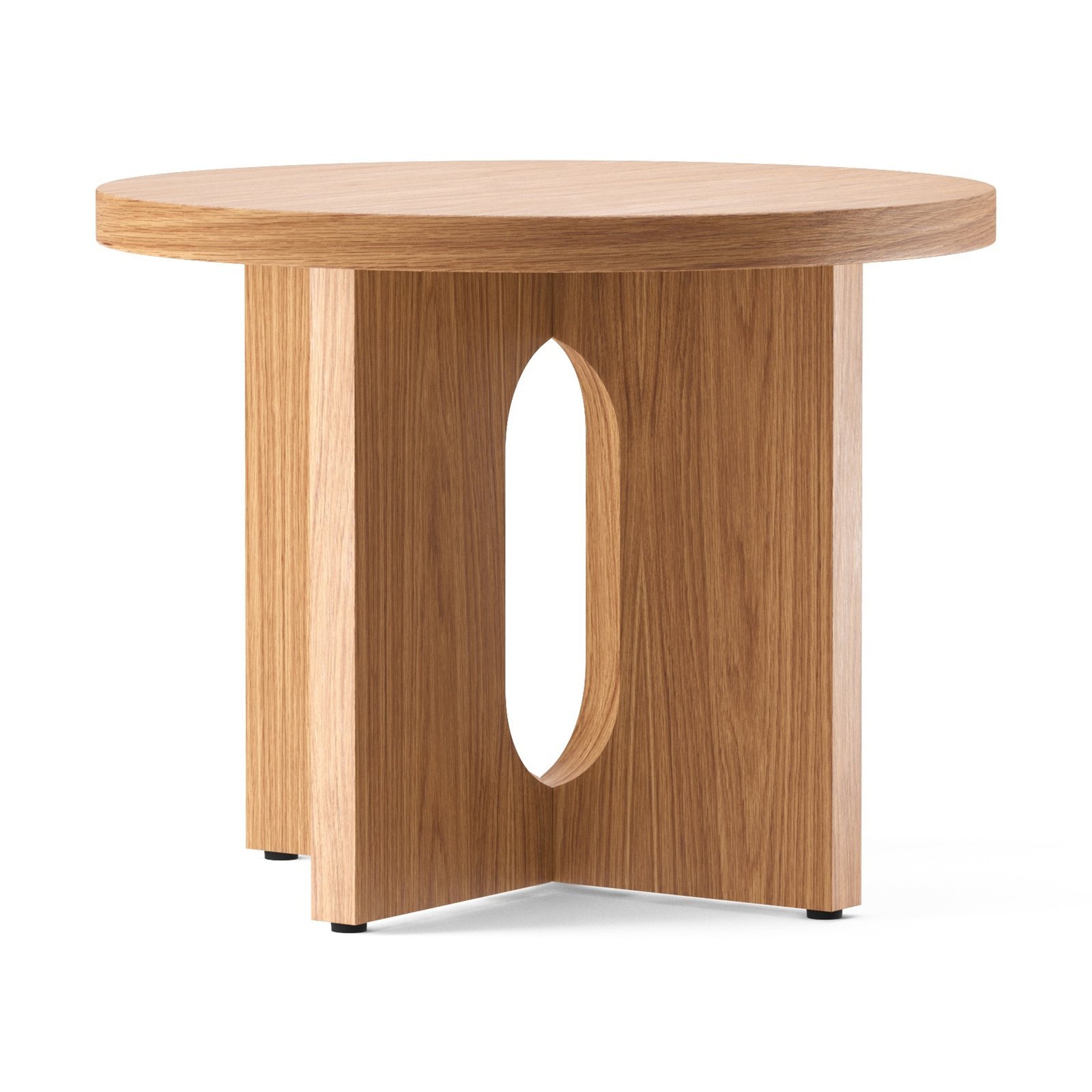 The Androgyne side table is made of CNC-cut MDF with oak or walnut veneer. It features CNC-cut steel fittings with a powder-coated finish. Each product is unique due to the natural materials, and surface nuances may vary