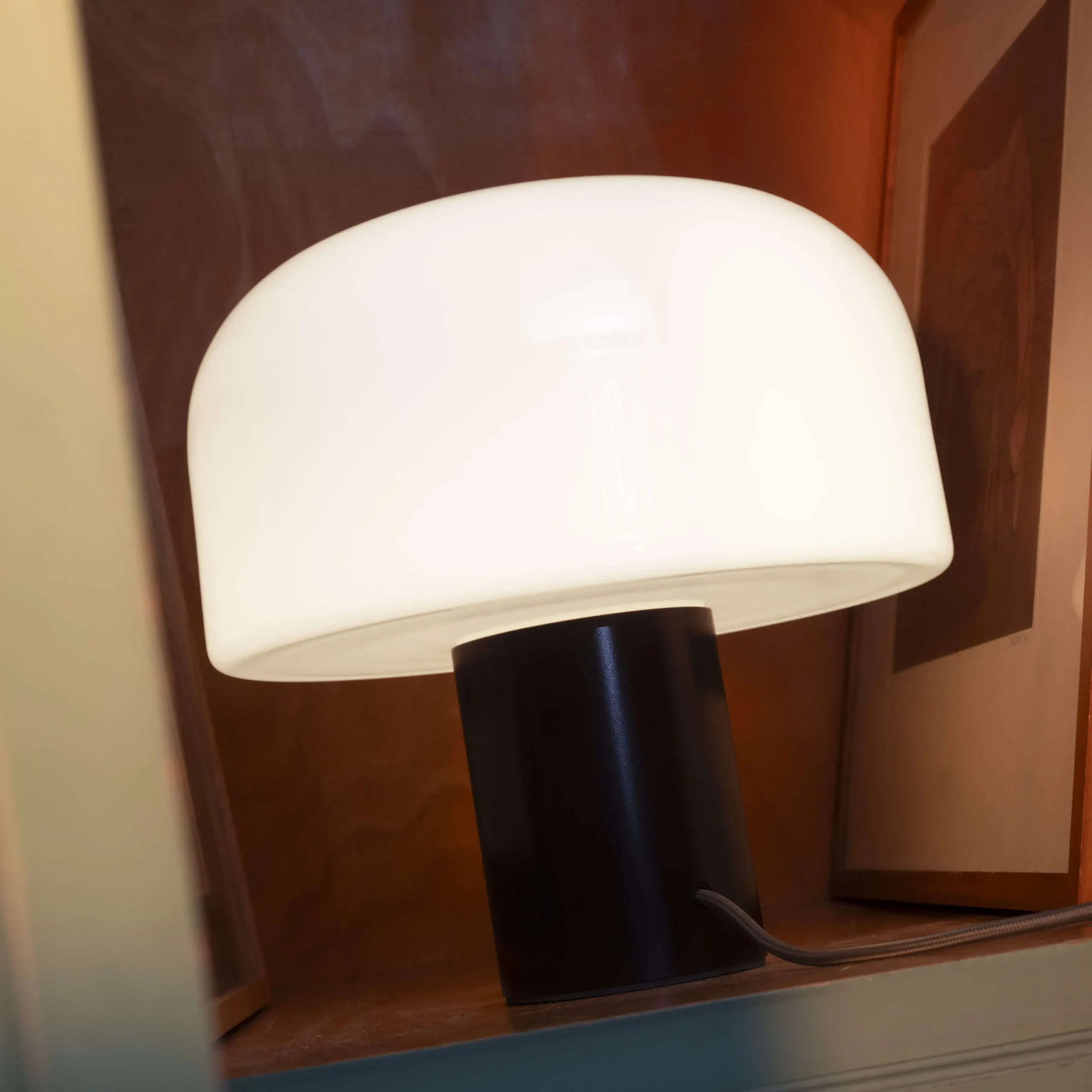 A large-scale table lamp. The dome is composed of a triplex opaline glass diffuser, structured as a sandwich of glass layers, with the white layer inserted between two transparent ones that are blown together simultaneously. The thicknesses vary for each layer. This design has been developed in collaboration with the Flos R&D Department. The use of triplex opaline glass and the large size, which keeps the light source at a distance from the inner surface of the diffuser, allows for uniform, warm, and welcoming lighting, creating a pleasant atmosphere in the space. This version of the Bellhop Glass lamp, with a diameter of 33 cm, rests on a cylindrical aluminum base of 12 cm in diameter and is available in Bright Aluminium, Cioko, and White versions. The materials stand out not only for their aesthetic value but also for their recyclability at the end of their lifecycle, emphasizing Flos's commitment to sustainability.