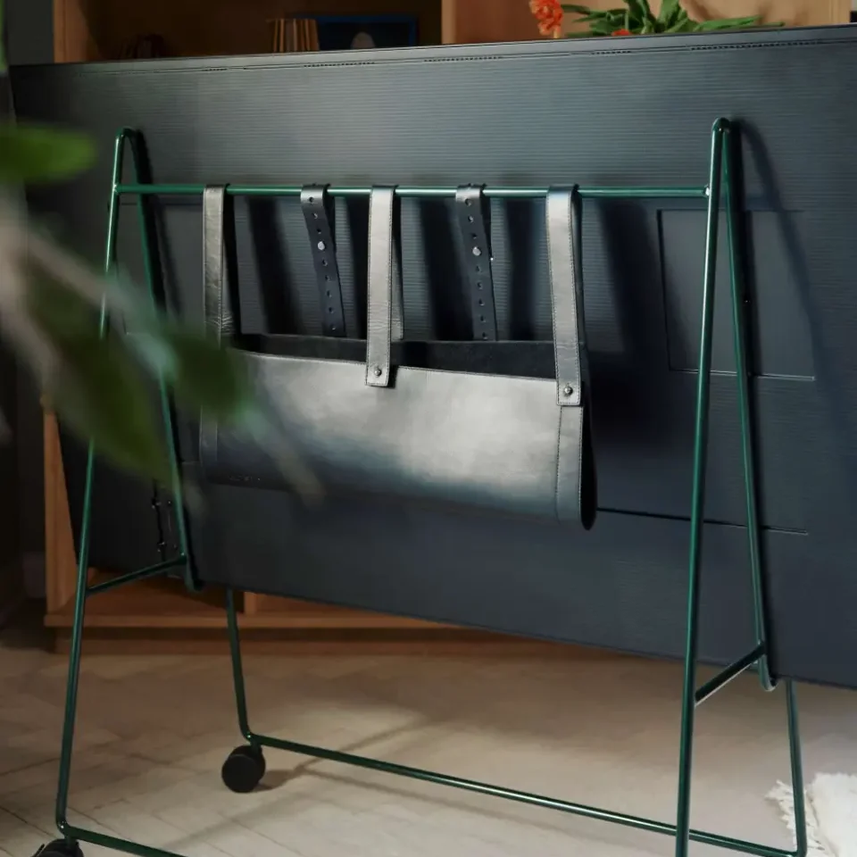 The CARRY TV stand on castors allows your television to move as freely as you do. The mobile stand adapts effortlessly, letting you reconfigure your space in seconds. Rotate the screen to avoid glare, roll it aside to free up space, or wheel it into the bedroom for a cozy night of binge-watching. With its easel-inspired frame, crafted from powder-coated steel, CARRY appears light and delicate, yet securely elevates your TV, creating a floating, airy look. It supports TVs from 40 to 65 inches, with leather straps at the back ensuring a secure hold. The gentle backward tilt optimizes the viewing angle, whether you're lounging on the sofa or cooking with your favorite show on in the background. For a clutter-free look, add the CARRY TV Pocket, a discreet storage solution that hides cables and media boxes, creating a tidy, minimalist setup.