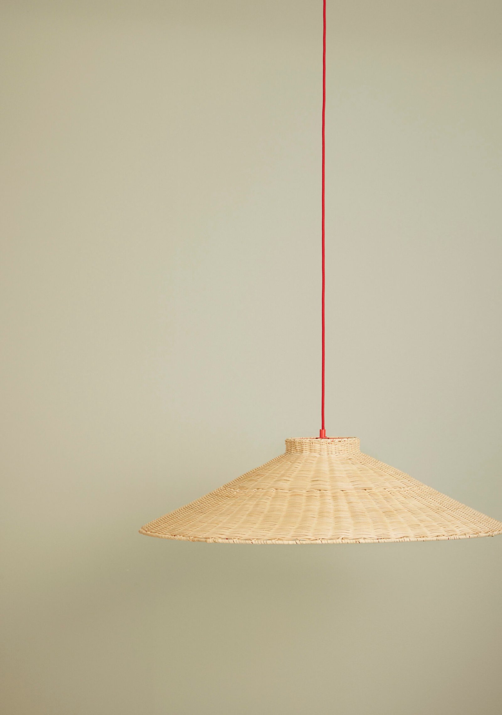 Stor loftslampe i trapez-form med rød stofledning.