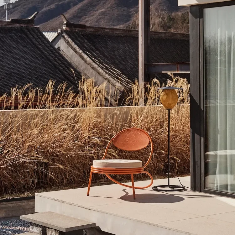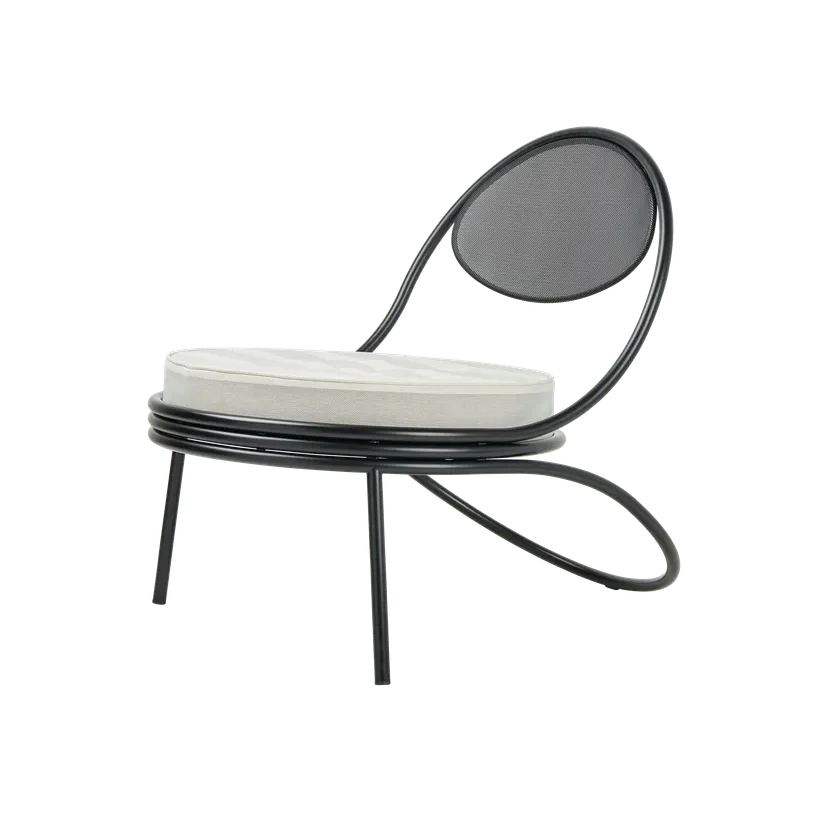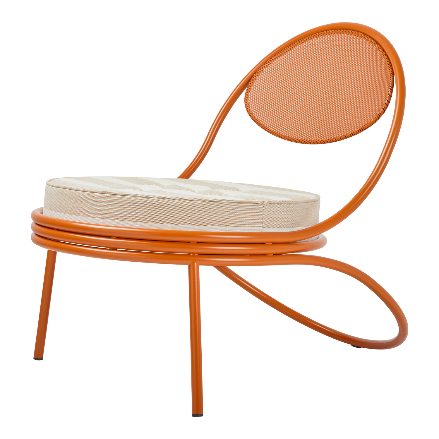 The Copacabana Lounge Chair was created in 1955 by Mathieu Matégot. The low Copacabana Lounge Chair has the impression of being designed with a single pencil stroke and the elegance of the chair resides in the continuous force of the line. It is constructed on the basis of a curved tubular frame that surrounds the round seat and the back made of the perforated metal Rigitulle sheet that often signifies the work of Matégot, ending with the continuous rear legs. The lounge chair, available in black and orange frames, is suitable for both indoor and outdoor use, depending on the fabric upholstery of the seat cushion.