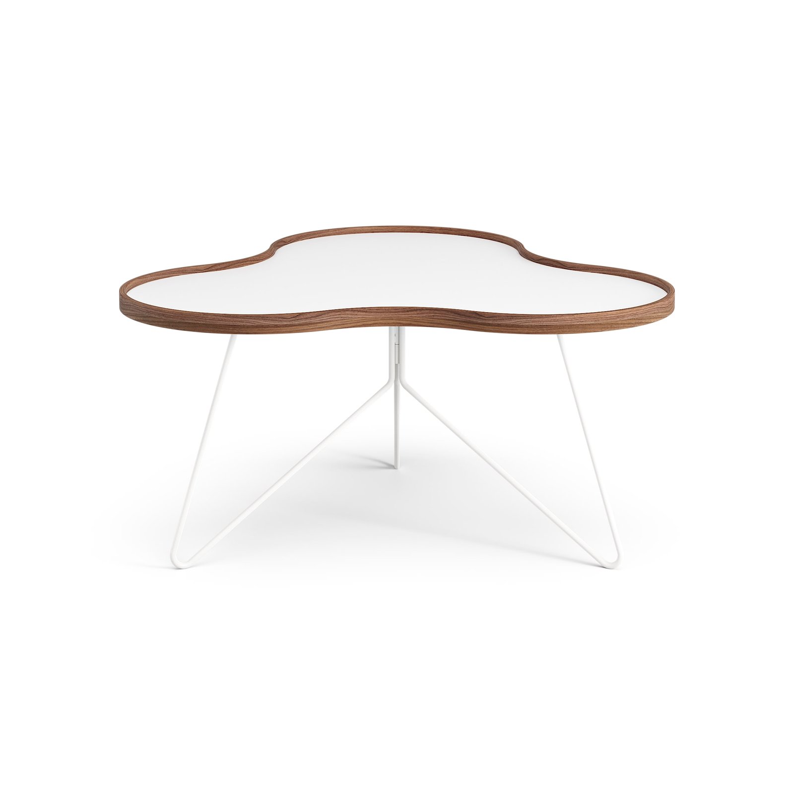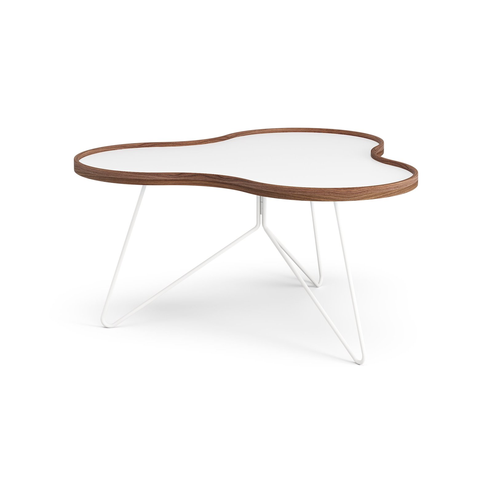 Flower bord 90 x 84 cm. Bordskiva i vit laminat. Sarg i naturlackad valnöt. Stålstativ i vitt. Höjd 45 cm.