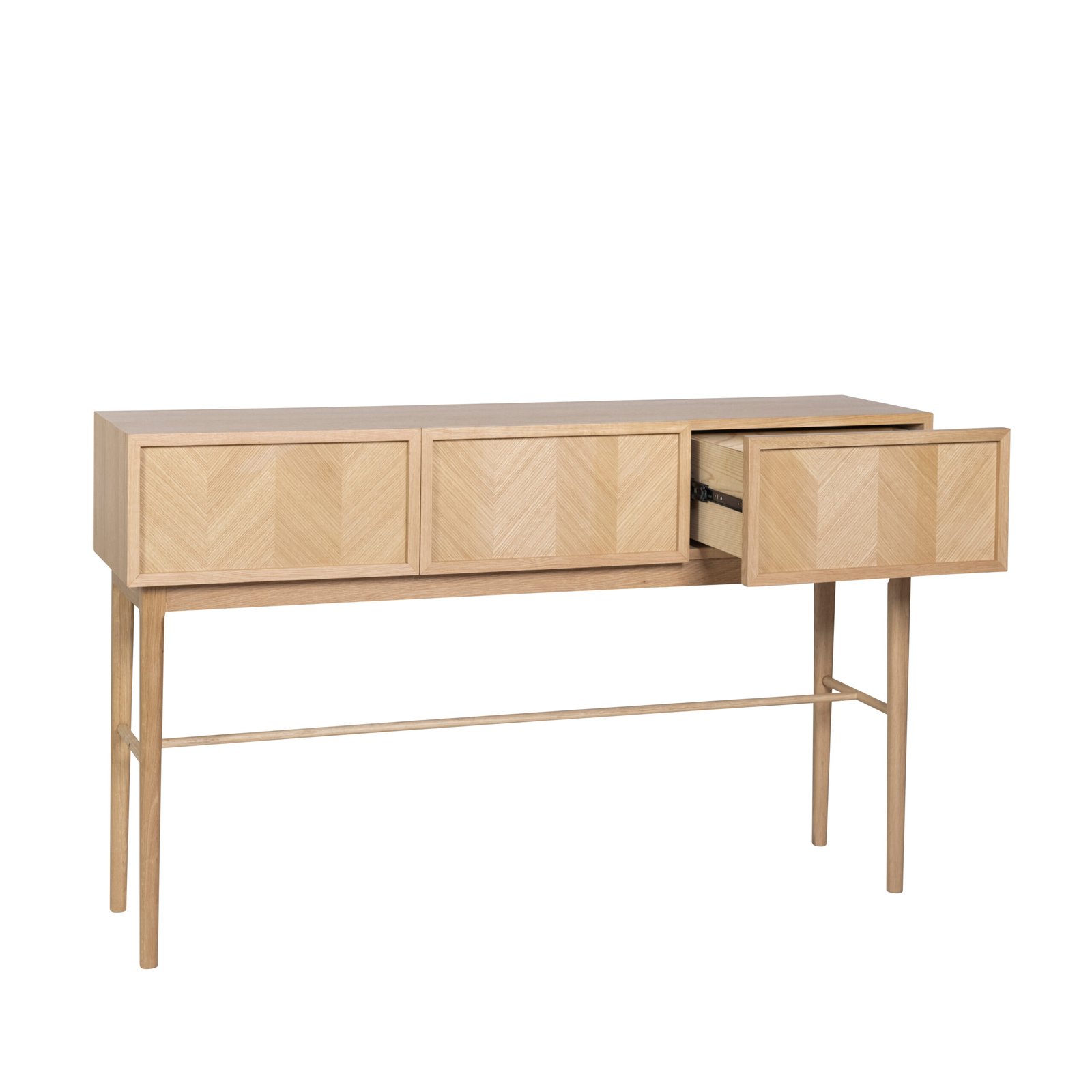 Konsolbord i natur med tre skuffer og sildebensmønster lavet af FSC®-certificeret egetræsfiner.