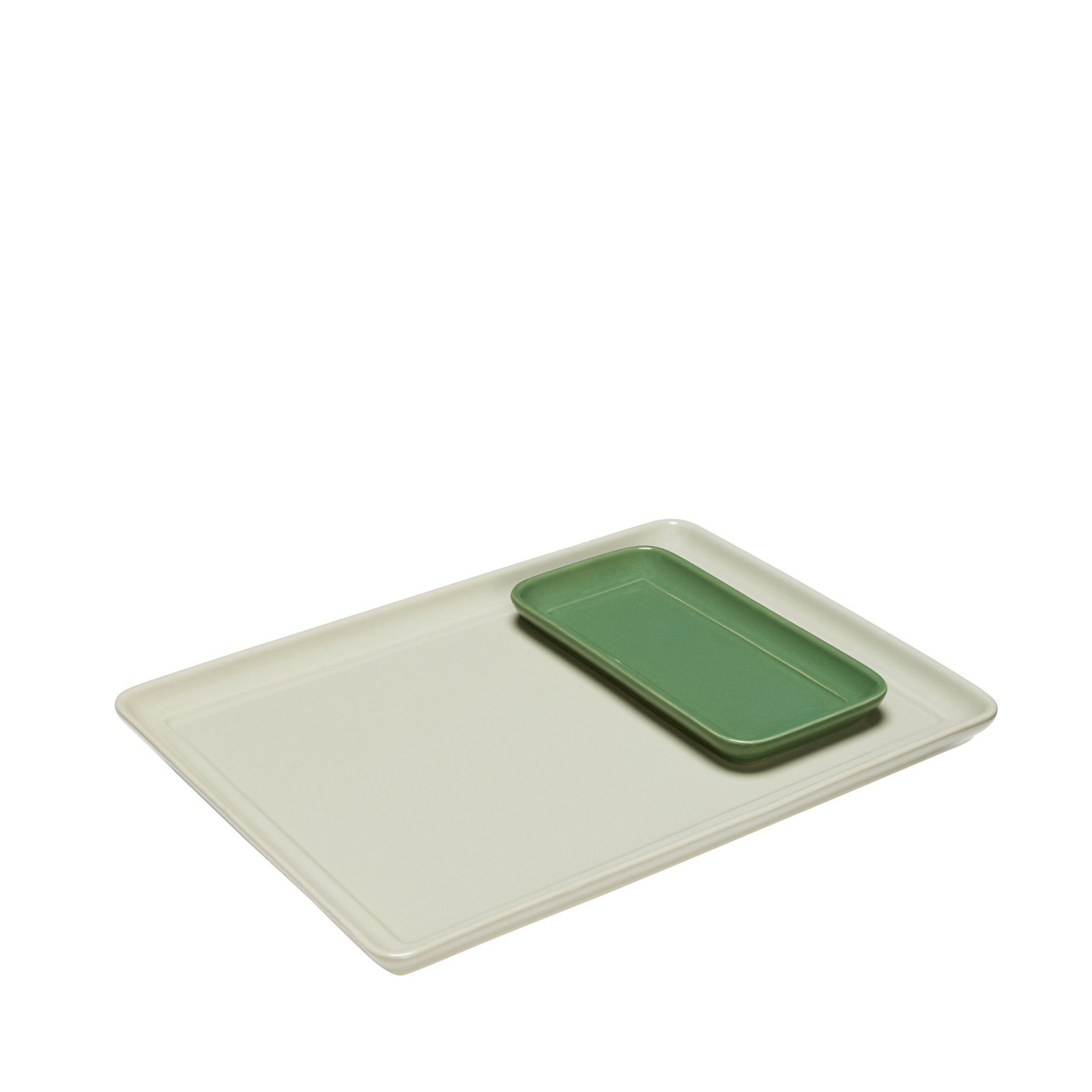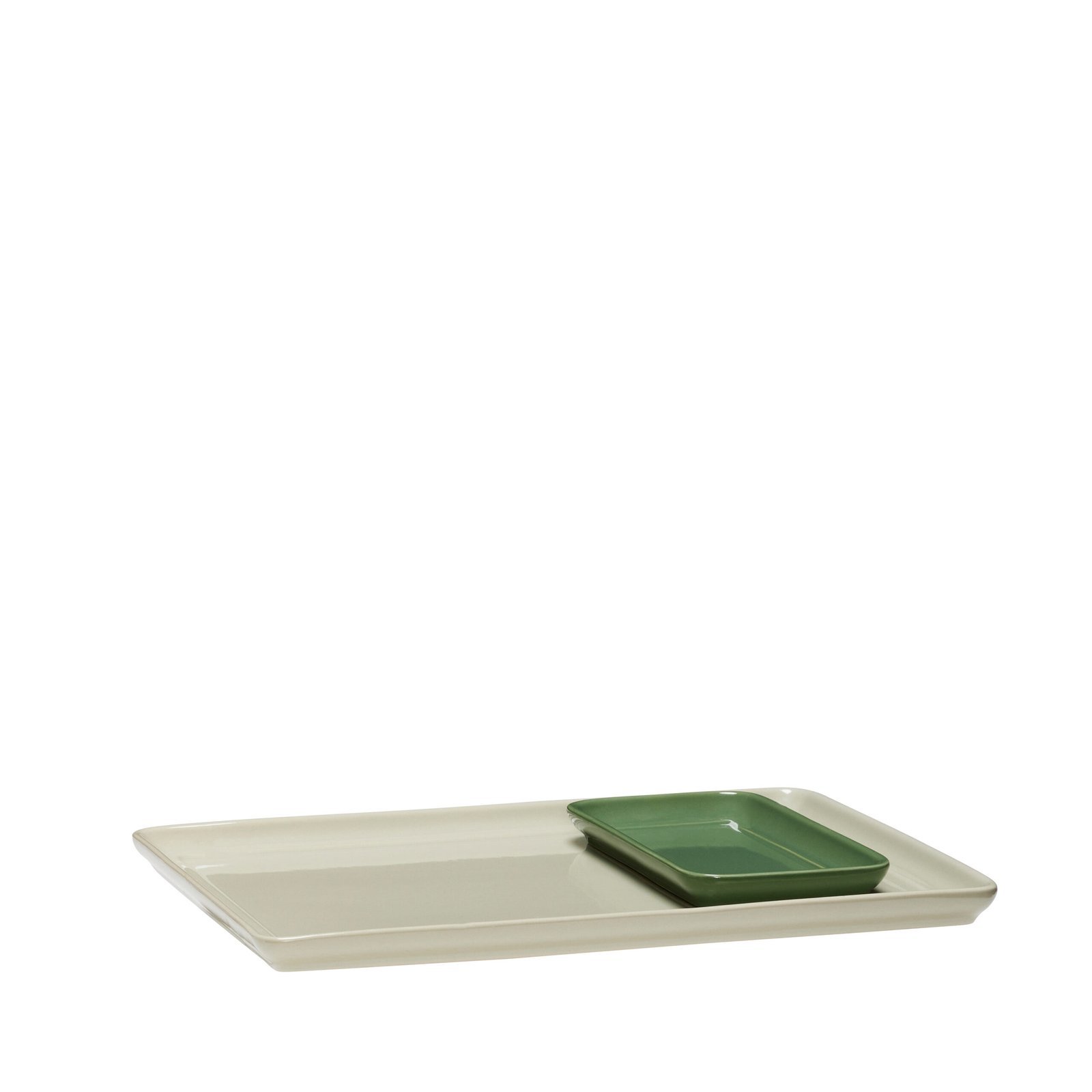 Stor bakke i keramik i farven sand med en mindre grøn bakke i keramik.