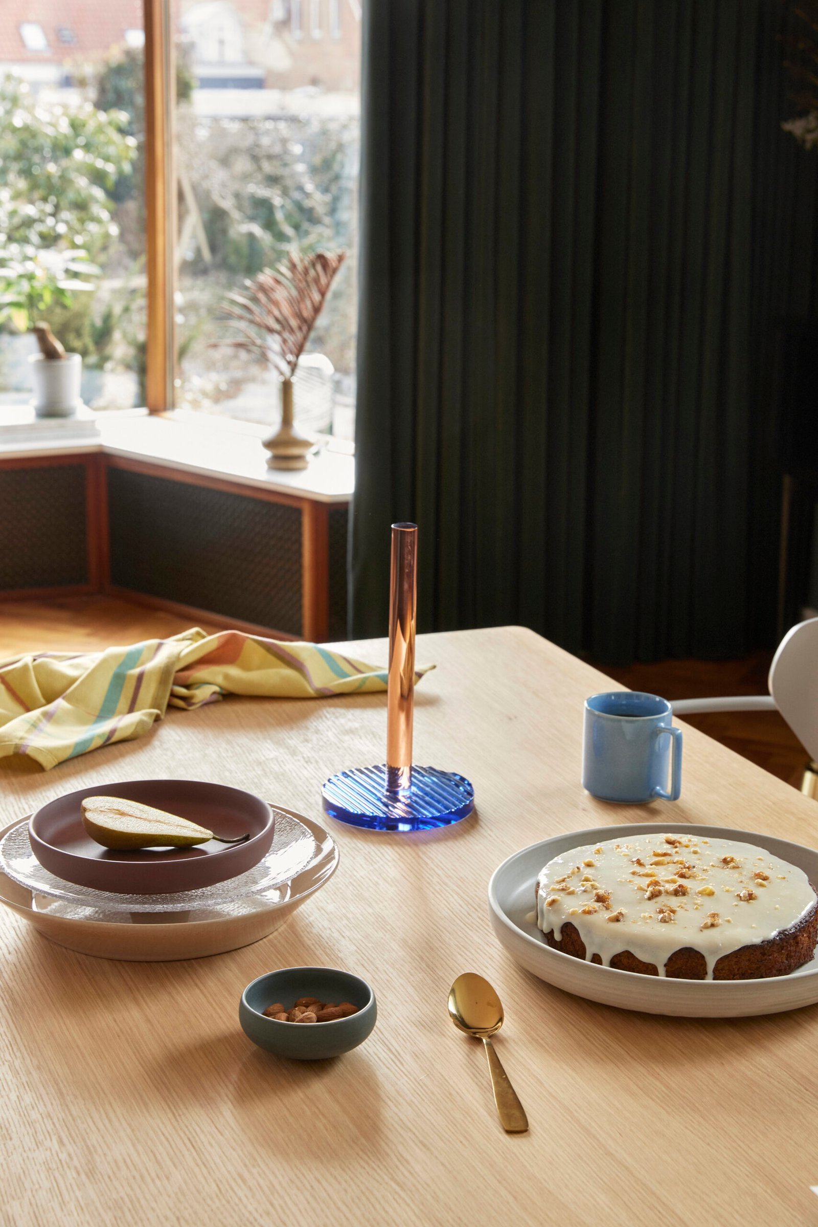 Køkkenrulleholder i pink og blåt krystalglas.