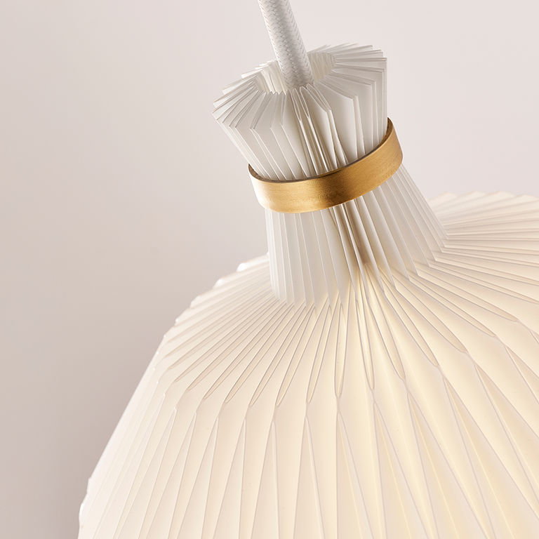 Den lille pendel er udstyret med en hvid tekstilledning og en elegant messingring, som understøtter lampens eksklusive udtryk. Det klassiske håndværk kombineret med det enkle ophæng gør modellen både tidløs og alsidig i indretningen.