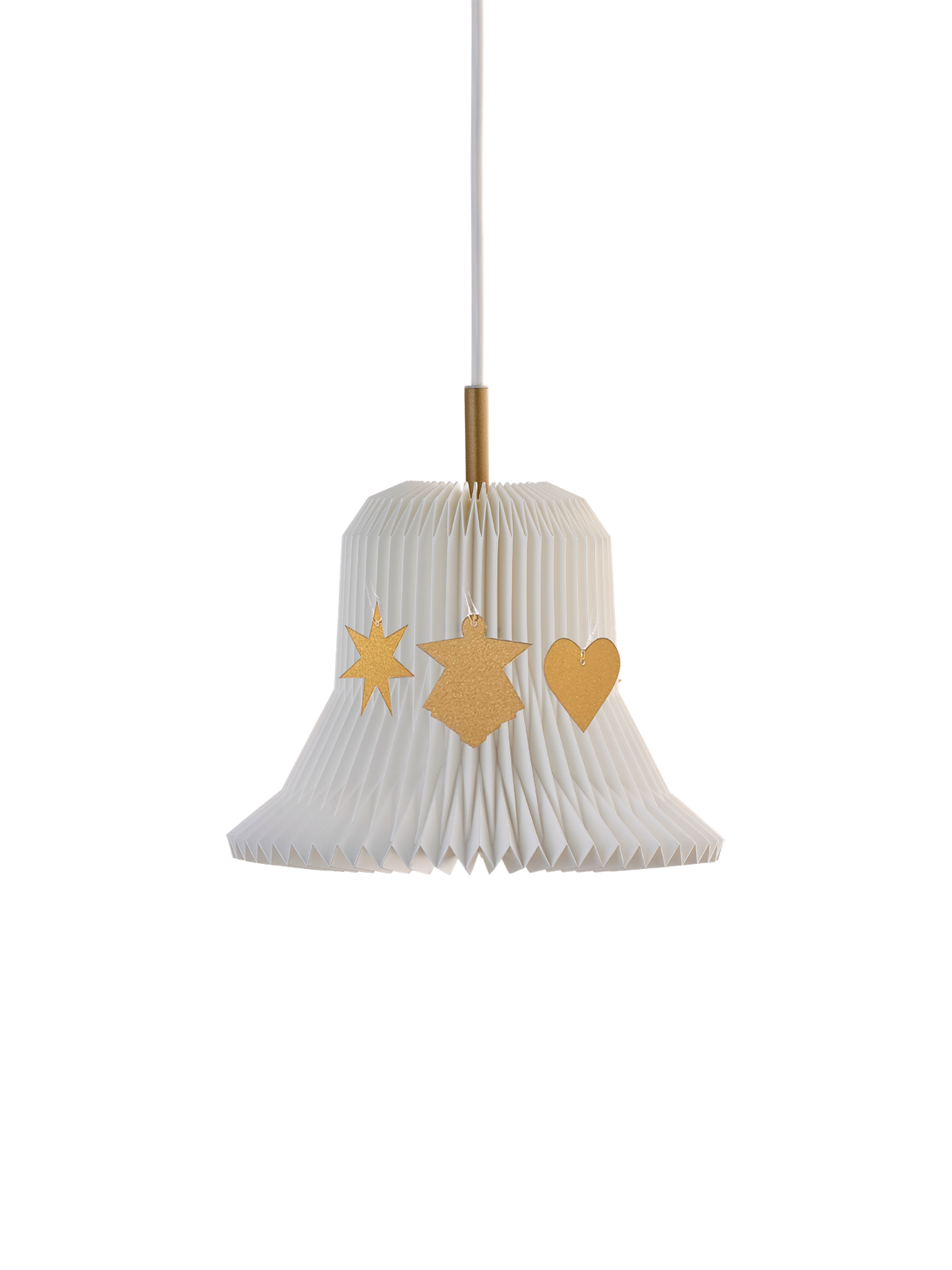 Vi er glade for at præsentere vores klassiske og smukke håndfoldede juleklokke, der nu er tilbage i vores sortiment. Juleklokken, model 193, er oprindeligt designet af Poul Seest Pedersen og relanceres nu i en udgave hvor vi efter idé fra vores Brand Manager Isa Dawn Whyte Jensen har tilføjet et golden ophæng og tre papir vedhæng i farven golden. De smukke vedhæng er silhuetter af vores kendte pendler: engel, hjerte og stjerne.