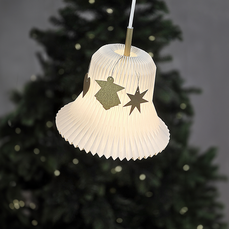 Juleklokken er produceret efter de samme principper og materialer som vores håndfoldede lampeskærme. Den leveres med 5 meter hvid ledning med tilhørende stikprop, lige klar til at hænge op.