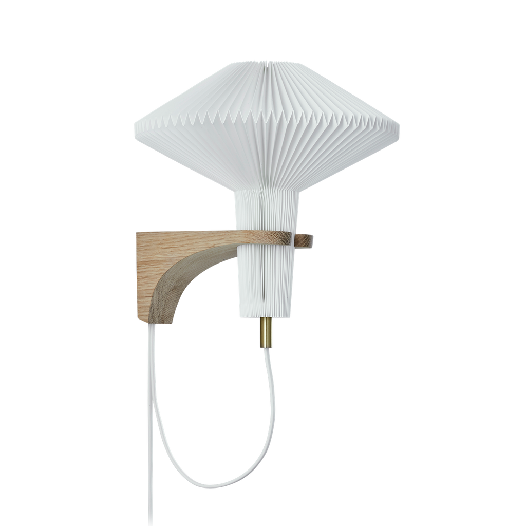 Lampen er en væglampe med en base i ubehandlet lys eg eller røget eg. Den plisserede skærm er håndlavet af vores foldeteknikere i Odense. Det er naturligvis lampens facon, som har inspireret til navnet på lampen.