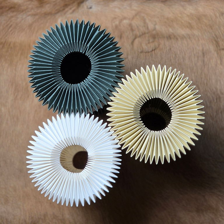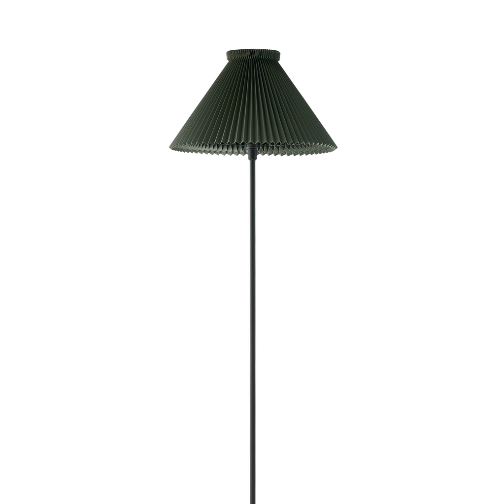 Gulvlampen kommer med et sortlakeret stel, og skærmen fås i hvid papir, klassisk hvid standardfolie eller i papirfarverne  Moss Green, Buttermilk, Dijon, Chocolate og Denim Blue.