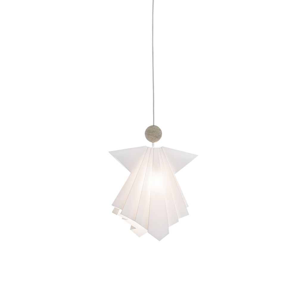 Med Englene har Tine Mouritsen ønsket at holde fast i de gamle foldeteknikker i et stramt og enkelt design, og de er fremstillet i samme kvalitetsmateriale og efter de samme principper som de verdenskendte håndfoldede lampeskærme. Alle modeller er i hvid lampefolie/lys eg inkl. ophæng og lyskilde.