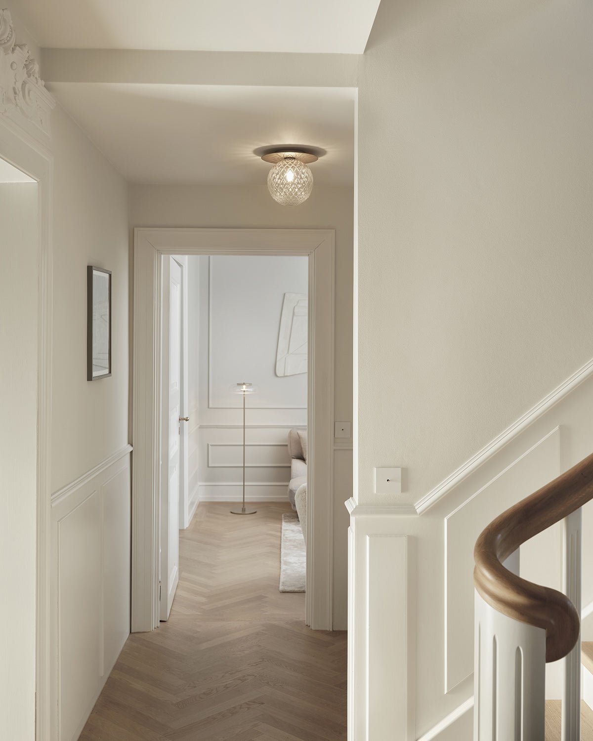 Liila 1 Large is a single lamp for the wall or ceiling. Liila 1 is simple in its form, consisting of a thin round sheet of golden metal and an optic clear glass sphere. Liila 1 Large is ideal as a ceiling light in smaller spaces such as a hallway or walk-in wardrobe. The lamp has an IP44 rating and is approved for installing in the bathroom as well.