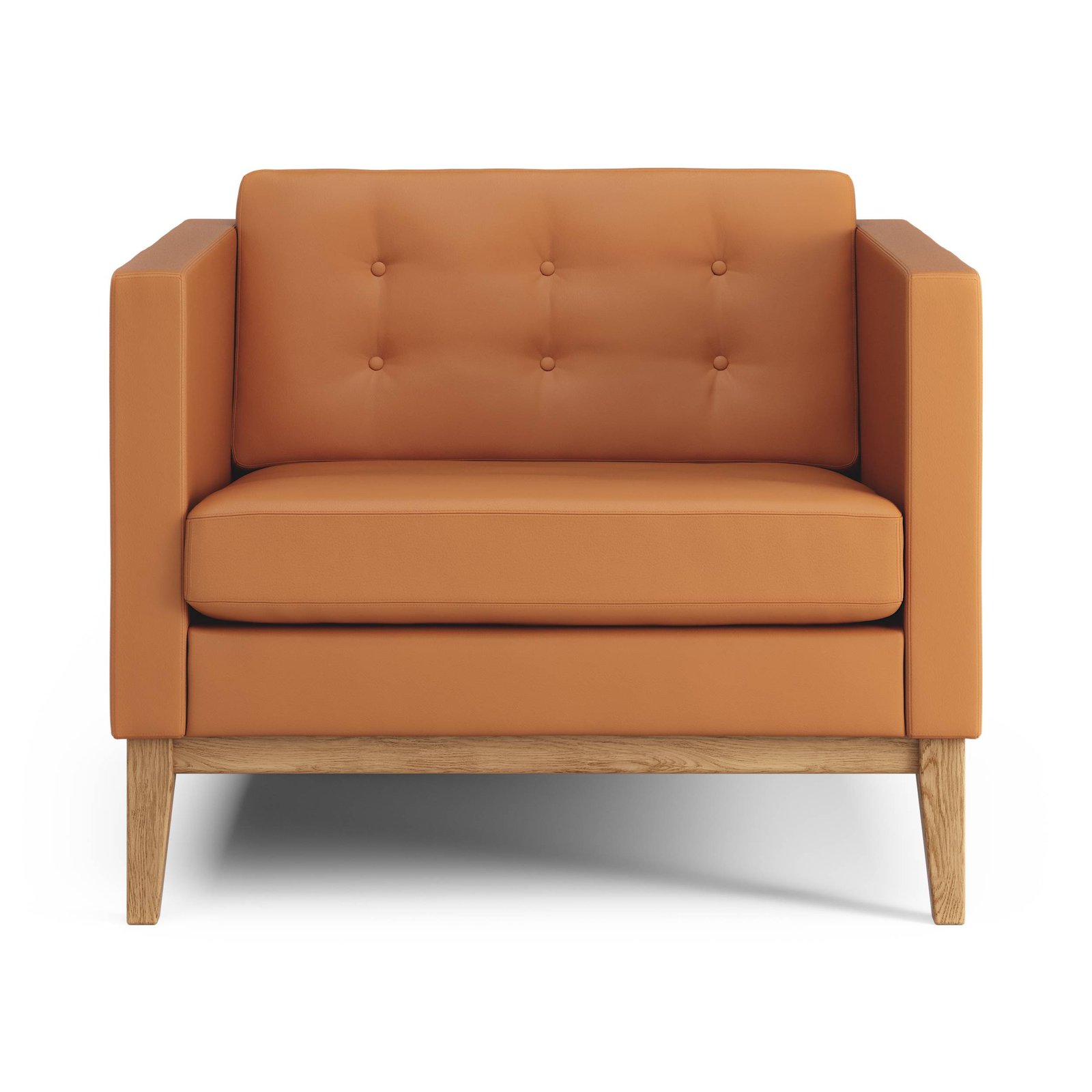 Madison fåtölj med 6 knappar i rygg. Bensarg och ben i ek.