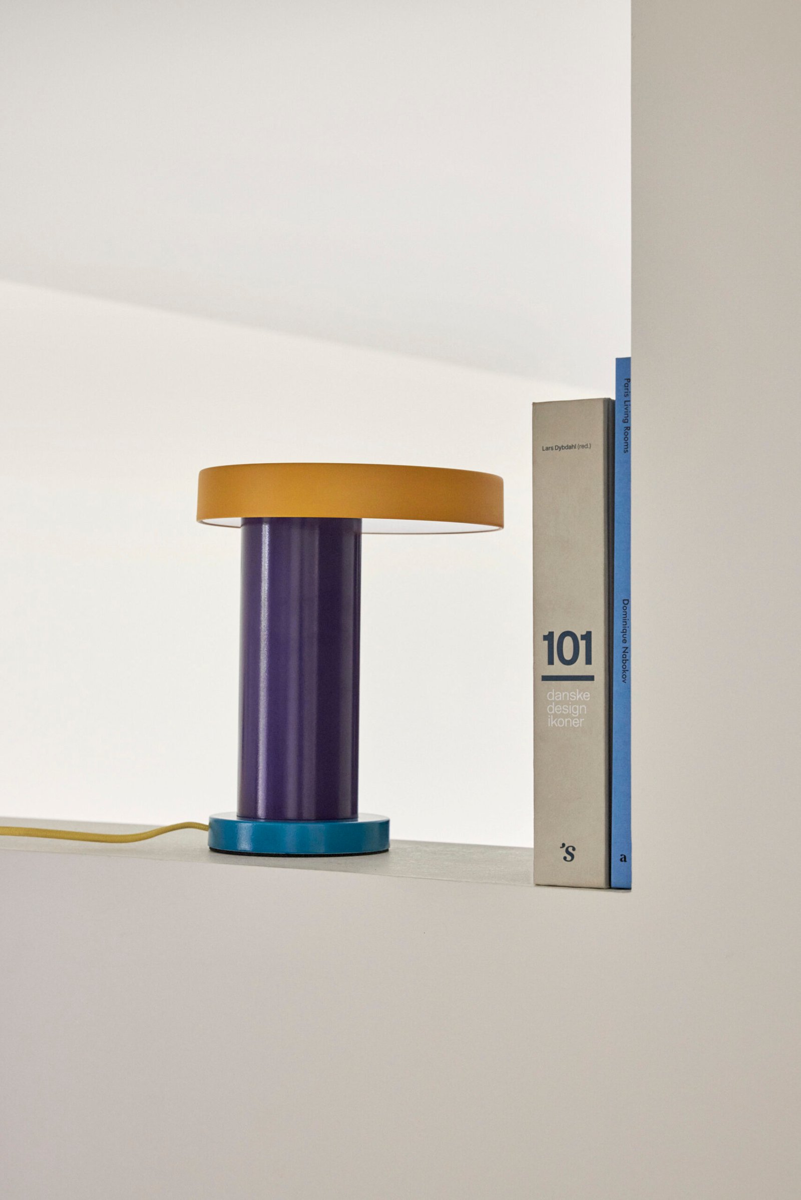 Trefarvet bordlampe med gul skærm, lilla base på en petroliumsfarvet fod med gul stofledning og lysdæmpende touch funktion.