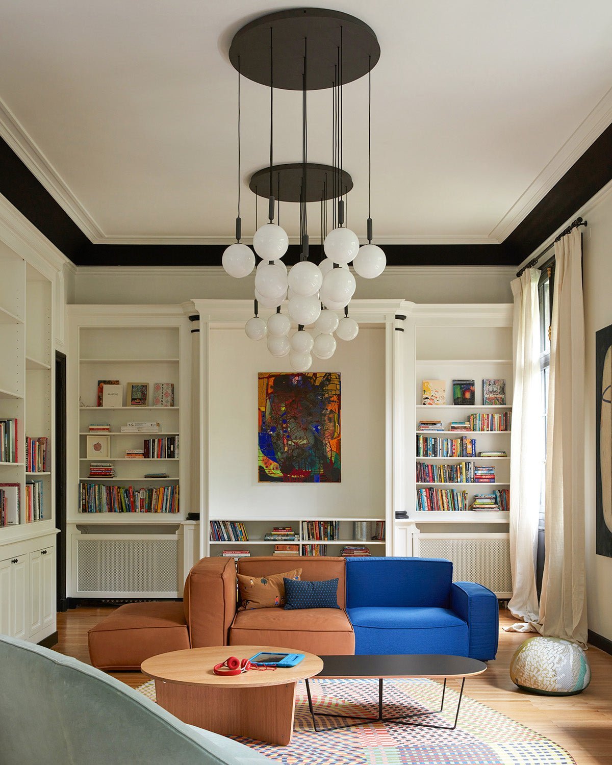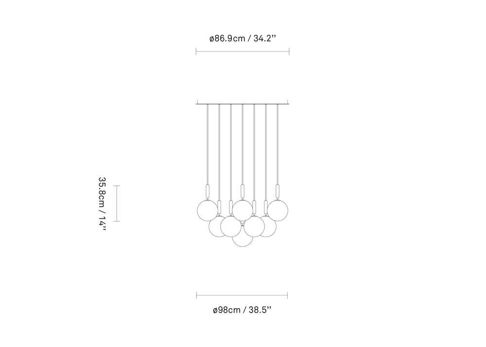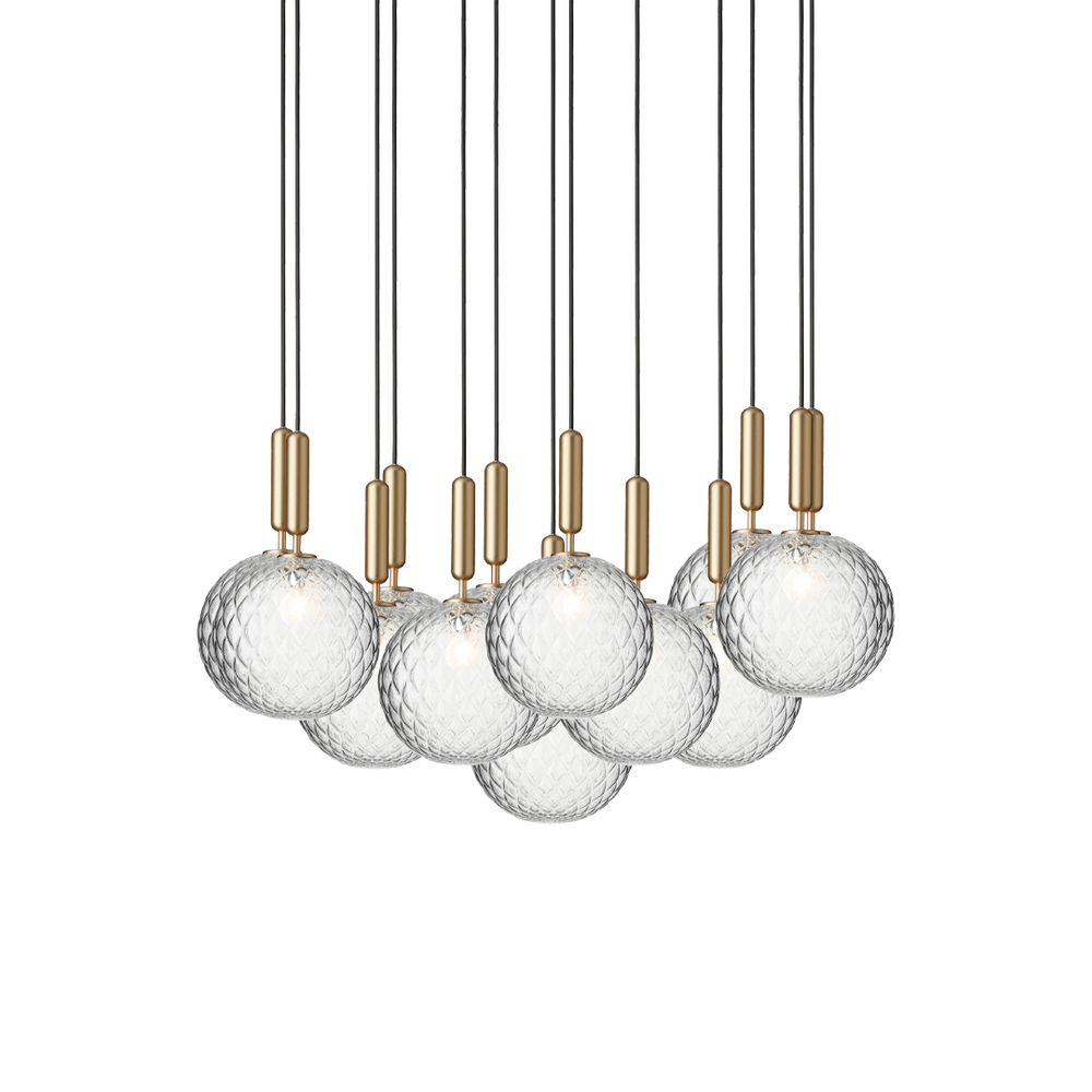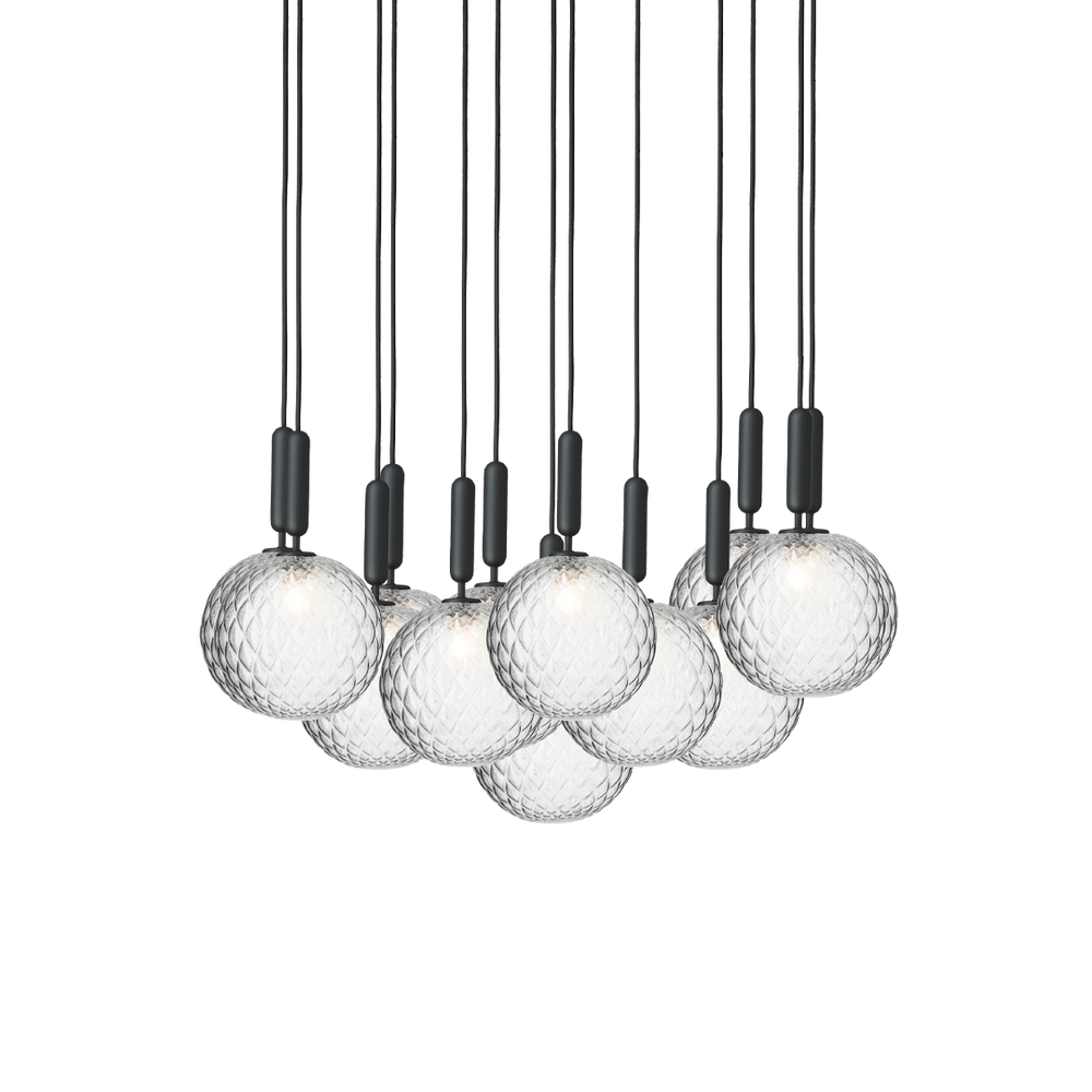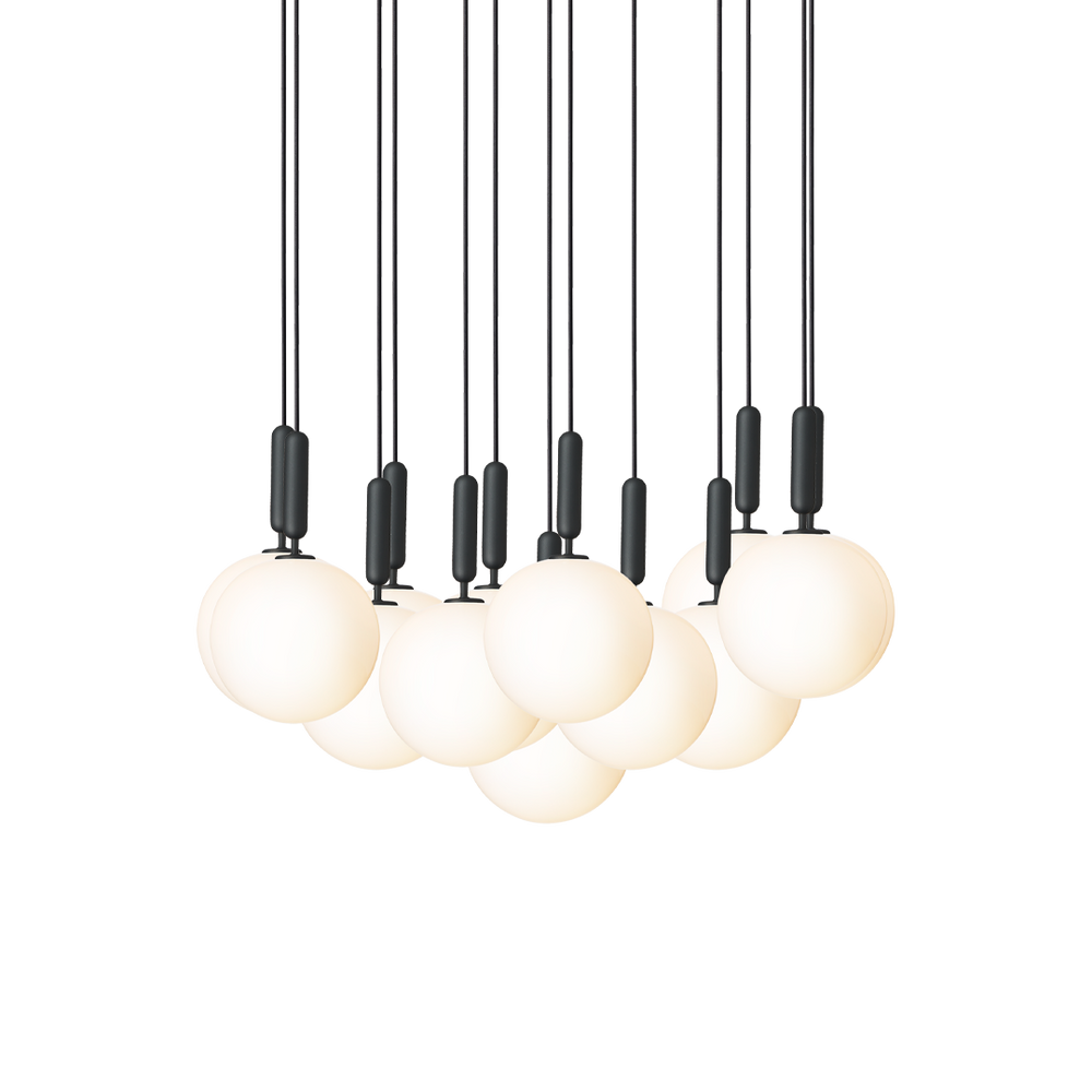 Miira 13 Large is an extraordinary chandelier consisting of 13 single pendants gathered in a large ceiling plate to create the chandelier expression. The pendants can be adjusted in different formations. Each of the 13 single pendants are ample and weighty, and the large glass globes add a bold expression to the room. Miira 13 Large chandelier is suitable as a centerpiece in a large hall, hanging above a staircase or spaces with high ceilings.