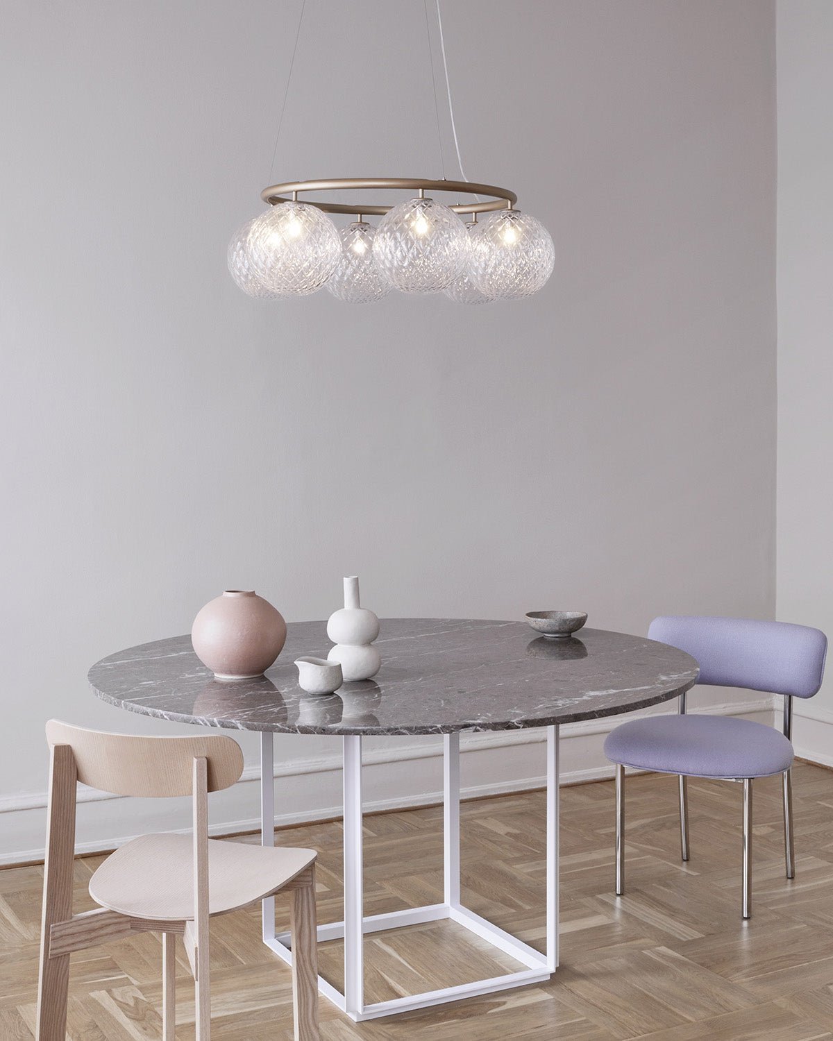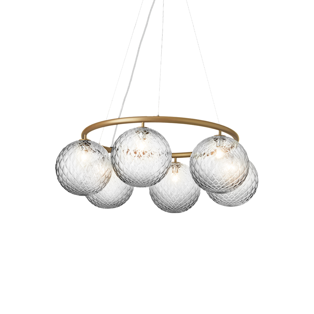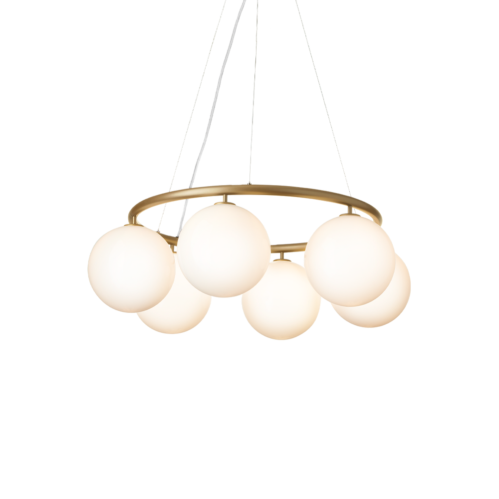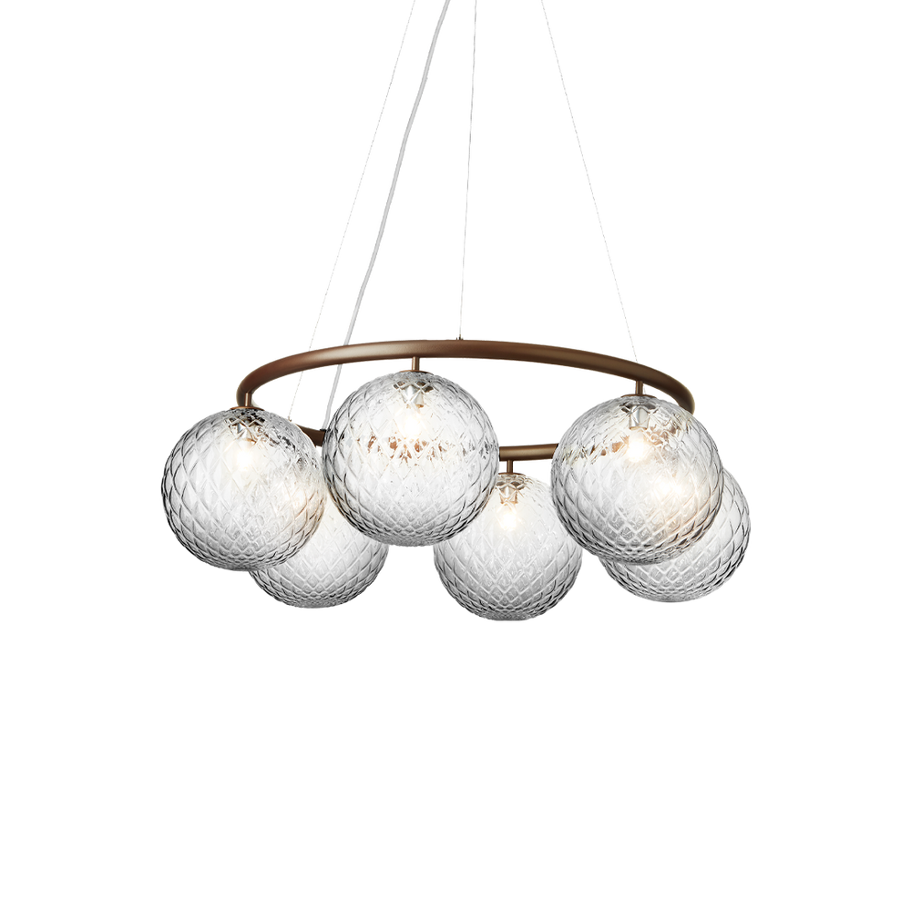 Miira 6 Circular has a classic appearance and is designed to hang high or low from the ceiling. The chandelier comprises a powder-coated metal ring in brass finish, and mouth-blown glass domes in optic clear glass spread a sensuous light. The simple, classic design makes Miira 6 Circular a useful element in many interior designs. The round chandelier features timeless charm and versatility, and is an ideal choice of lighting above a large dining table.
