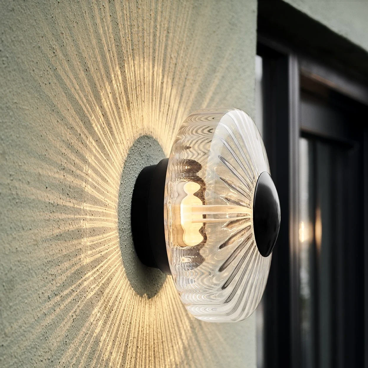 The iconic New Wave Optic Wall Lamp is now available in an outdoor edition. Crafted with mouth-blown wavy glass, it casts a captivating play of light that enhances any outdoor wall. The design combines functionality with atmosphere, creating both practical illumination and a warm, inviting glow.
