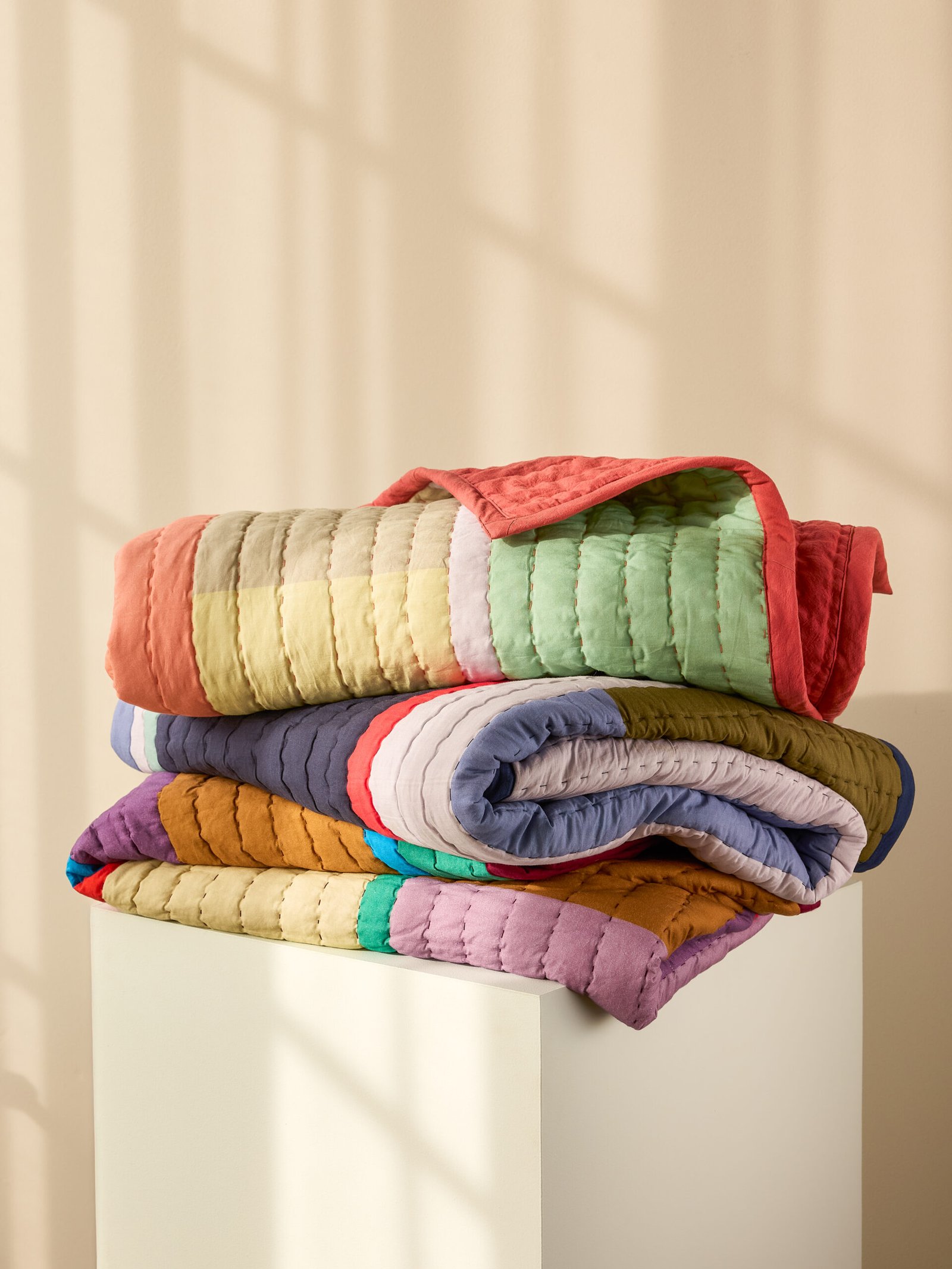 Præsenterer Pavilion Plaid i en fortryllende blå og flerfarvet palette, der omfatter blå og jordnære toner med et strejf af rød. Dette design, som er fremstillet med en hyggelig quilteteknik, garanterer en behagelig oplevelse. OEKO-TEX® STANDARD 100 certificeret og kærligt lavet af ren bomuld, er det ideelt til picnic eller til at holde dig varm på kølige aftener. Vælg din favorit blandt vores to charmerende varianter for at tilføre varme og farve til din hverdag.