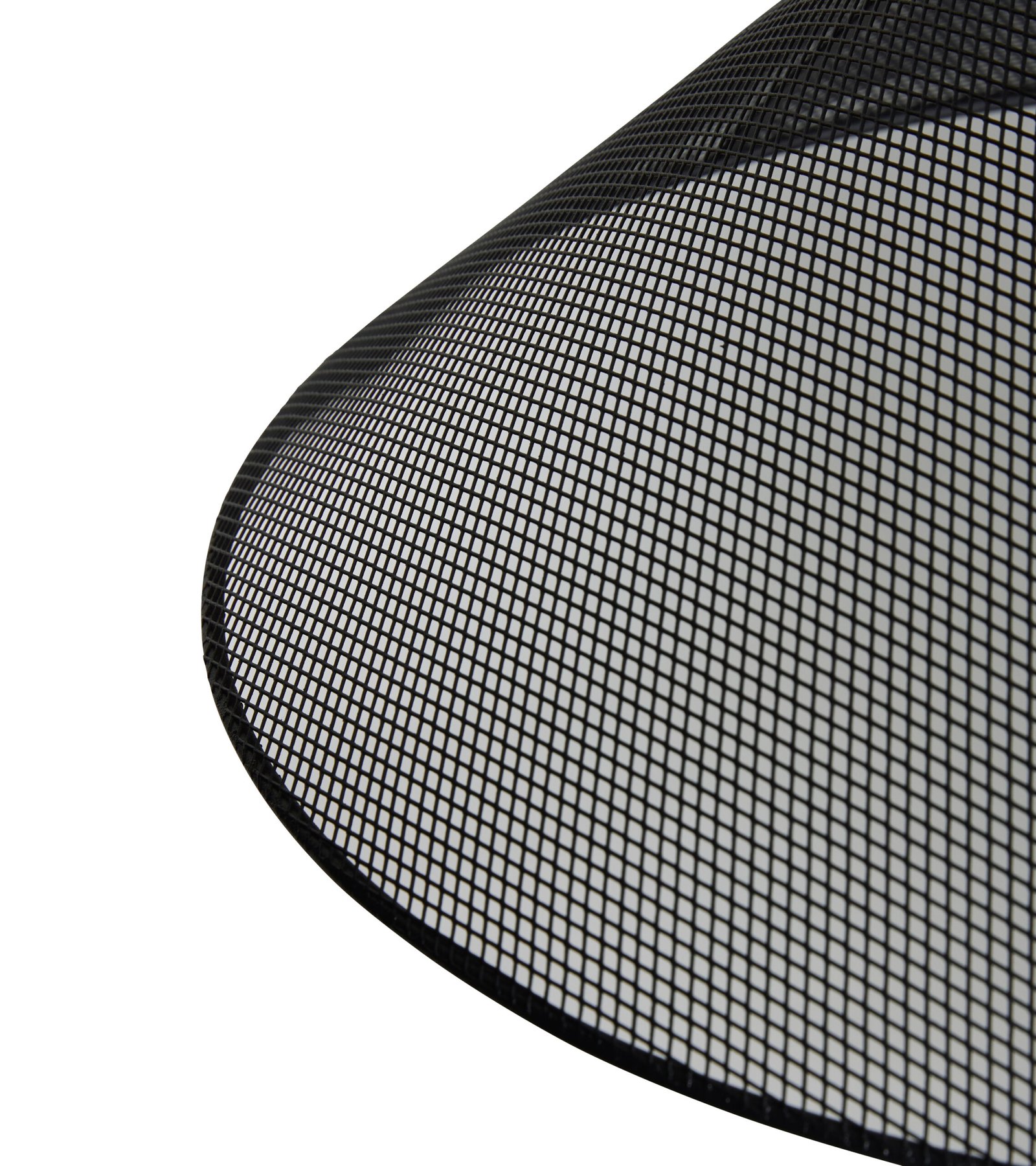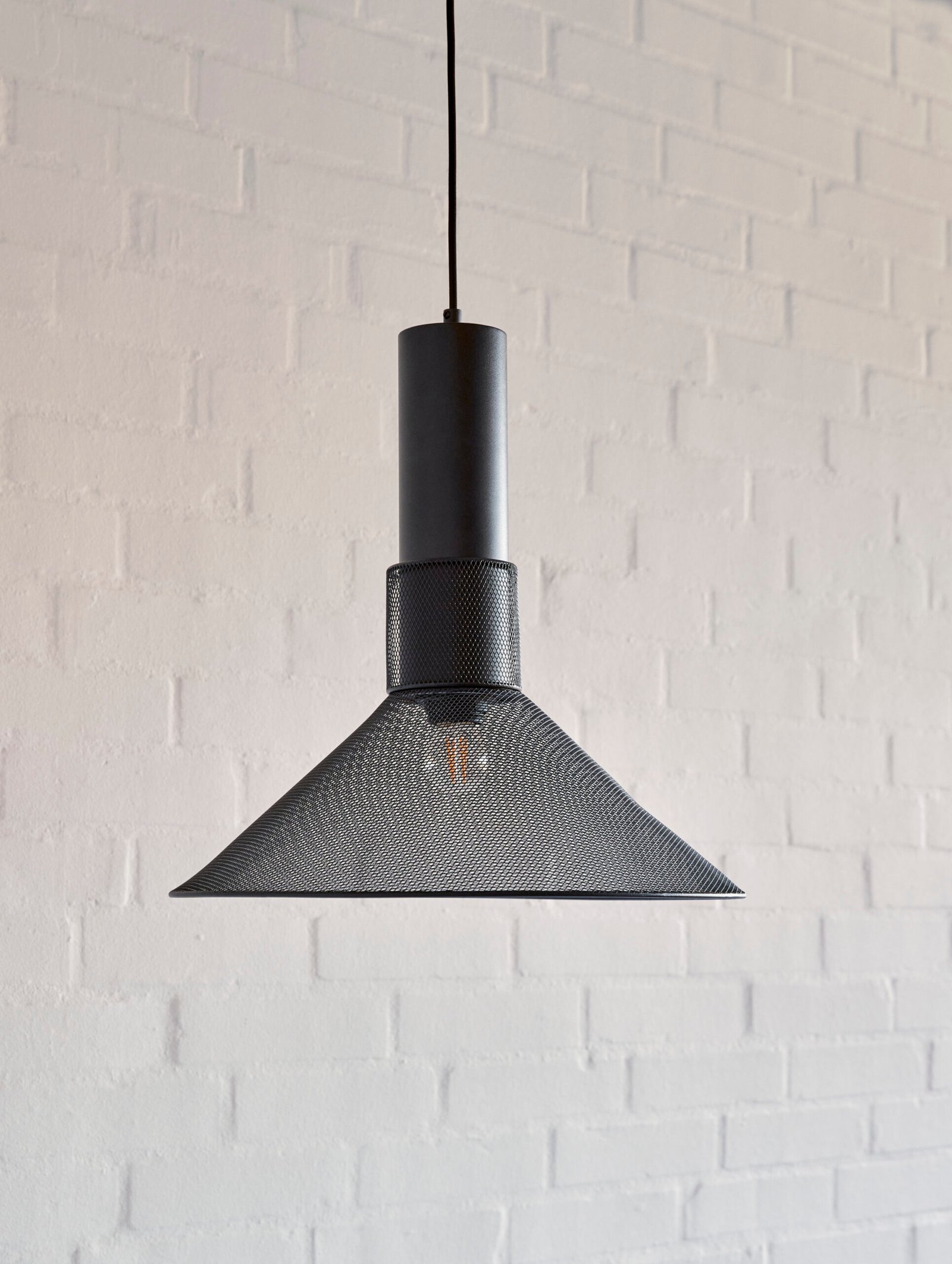 Stor sort loftslampe i trådnet med sort stofledning.