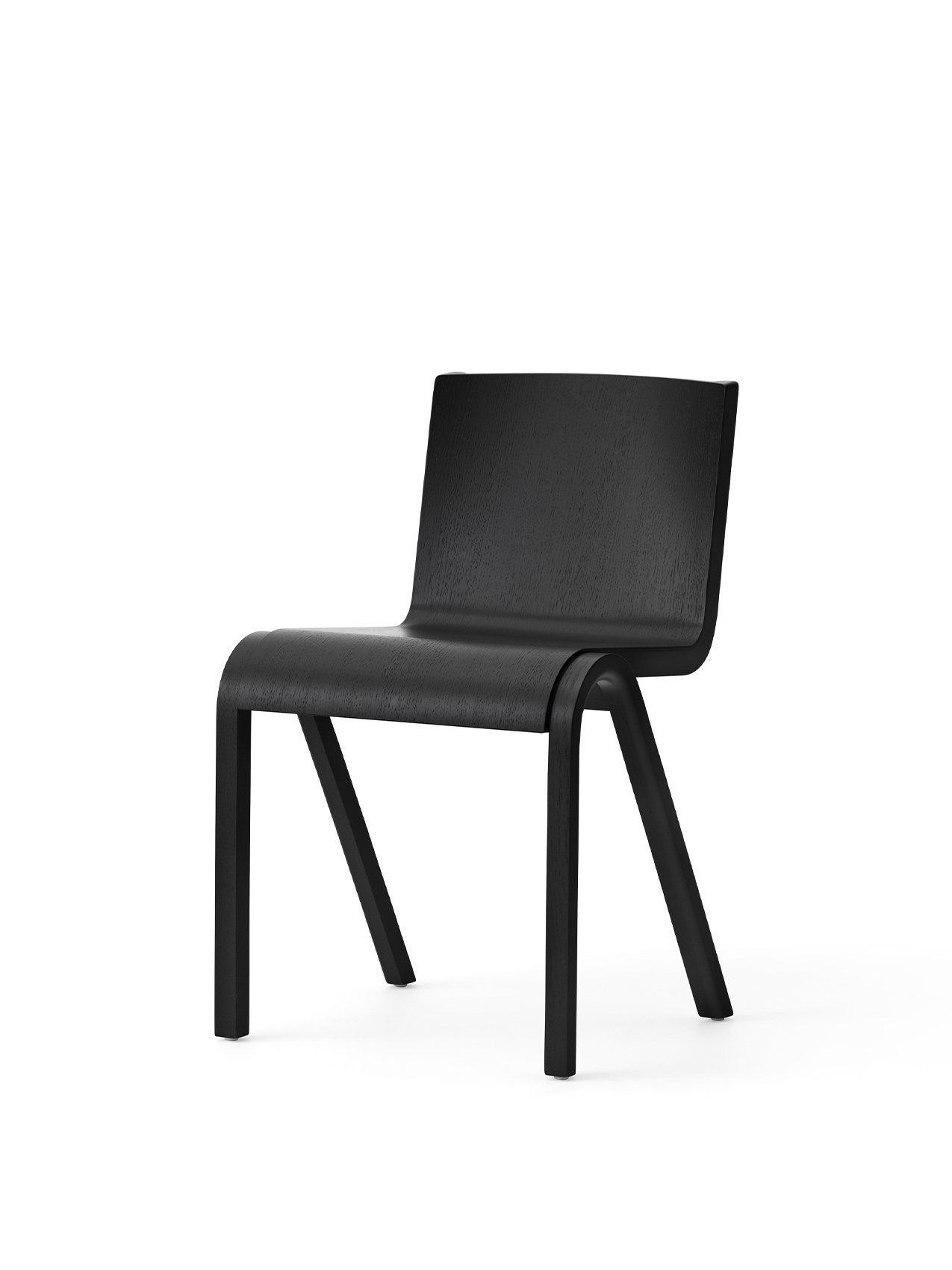 The seat and back are made from press-bent plywood, CNC-cut to shape, then assembled, glued, and lacquered. Available with different base finishes, the design comes in both upholstered and non-upholstered versions.