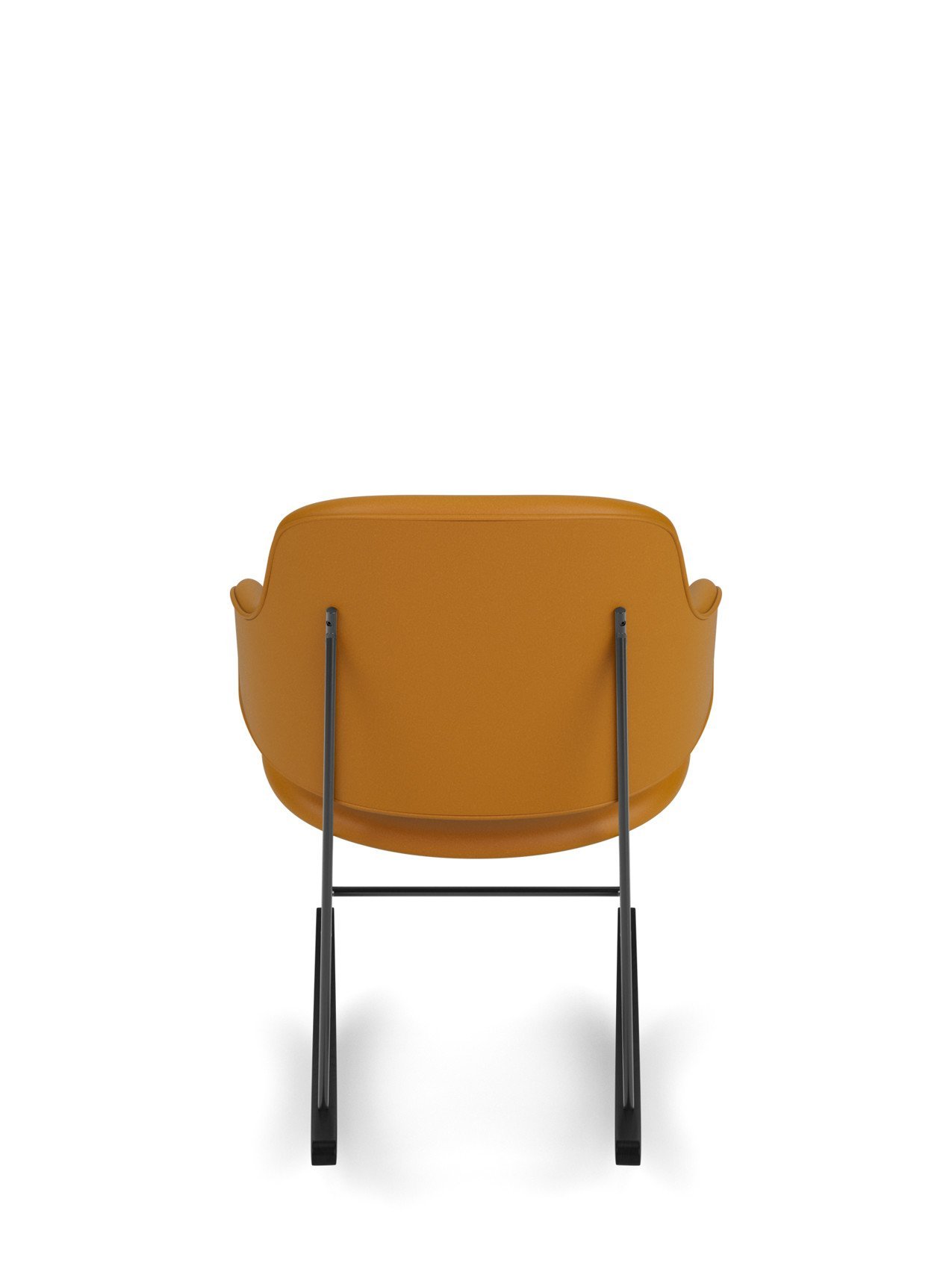 The cut steel frame is welded by robotic welding and then powder coated to obtain a robust surface. The seat and back are fully upholstered for a soft and comfortable experience. The rockers are CNC carved from ash and painted afterwards.