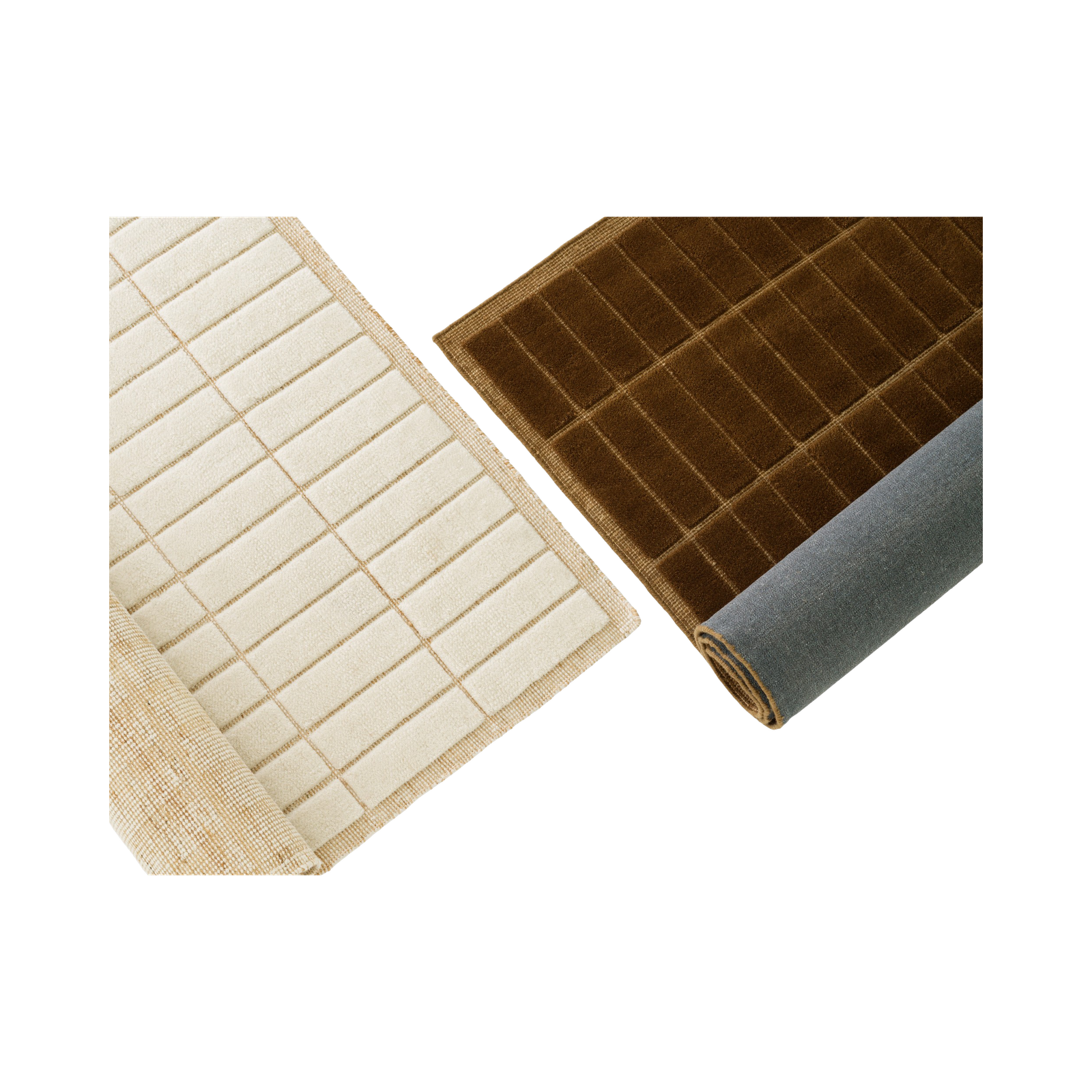 The rugs are handwoven with a cut pile, made from 75% wool and 25% jute, with jute in the warp. The backing is hand-sewn onto the back.